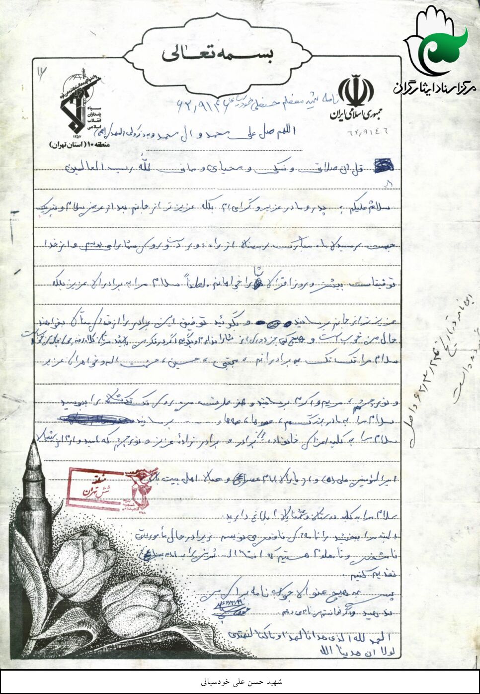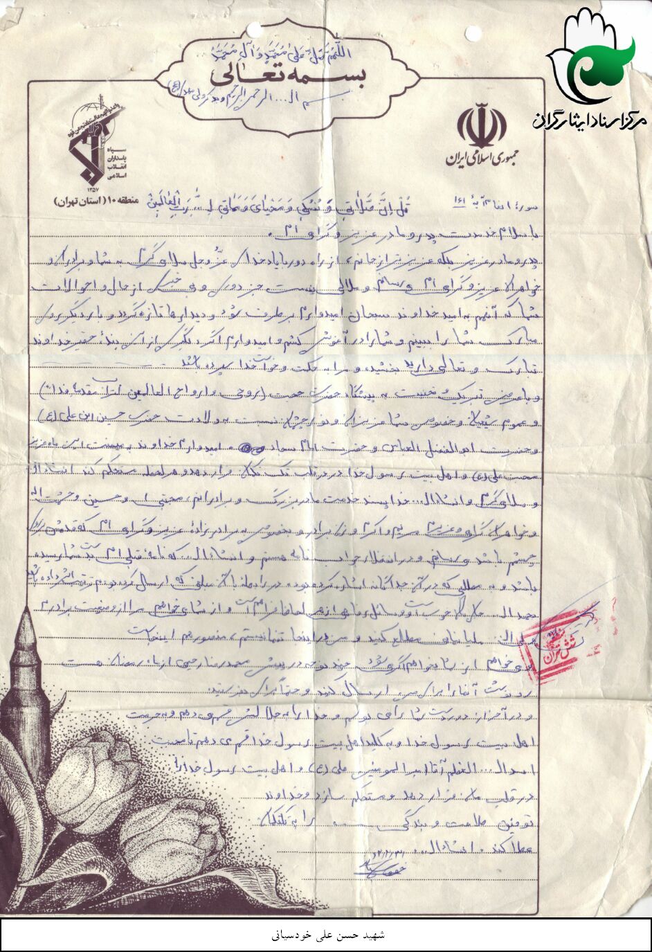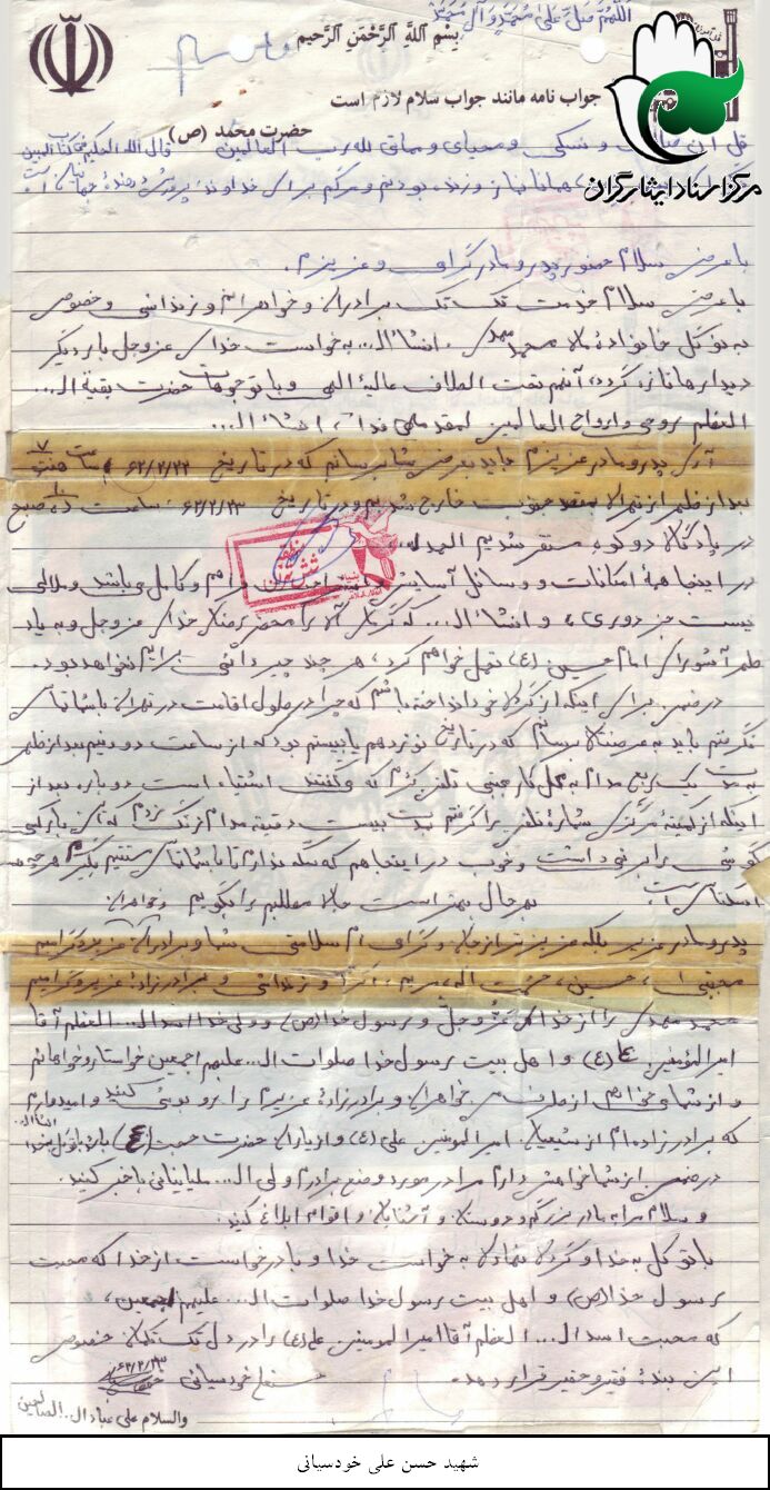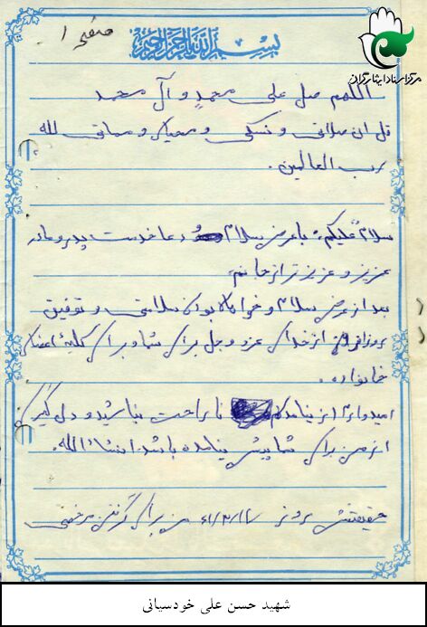 انجمن مدرسه بود. انجمن اسلامی مدرسه بود اگر من بگویم این یک چیز دیگری بود کسی باور نمی کند حسنعلی که به دنیا آمد 2 تا گوشش سوراخ بود من می گذاشتم روی زانوهایم و گوشواره هایم را در گوش او می انداختم تا شهید شد این را به هیچکس نگفتم تا شهید شد. باباش گفت حالا خانم با چه نشانه ای برویم پسرت را پیدا کنیم. شلوار برایش دوخته بودم گفتم این تکه شلوار است و گوش هایش هم که سوراخ است. گفت ای بی انصاف الان به من می گویی. گفتم این یک رازی بود خدایا تو شاهد باش که حسنعلی اصلاً یک چیز دیگری بود اصلاًاین بچه یک چیز دیگری بود. که خود نیک بین به من گفت حاج خانم من هم دوست دارم که مثل حسنعلی بشوم که آخرش هم همان شد. من به مادر او گفتم حاج خانم محمد می گفت من دوست دارم مثل حسنعلی بشوم که همانطور هم شد. اصلاً اهل محل کباب شدند برای این بچه. خدا رحمت کند خانم جمالی یک روز با بچه اش دعوایش شده بود آمد خانه ی ما و شروع کرد به دعواکردنش من میخواستم به خانم جمالی بگویم که چرا؟ هر وقت که یادش می افتاد گریه می کرد. همه اش می گفت این چی بود تو بزرگ کردی این چی بود بزرگ کردی من آمدم در خونه ات دستم را رویش بلند کردم و او گفت که هیچی نگو این بود مثلاً این خواهرها را آنقدر دوست داشت. زن و بچه برادرش را پدرش همیشه می گفت خانم این مال ما نبود. در جبهه به من پیغام داده بود که نوحه های حضرت زهرا را برای من بفرست که یک آقایی هست به نام محمدرضا من نوحه های حضرت زهرا را برایش فرستادم جبهه. در 6ماهی که جبهه بود نامه هم می داد.